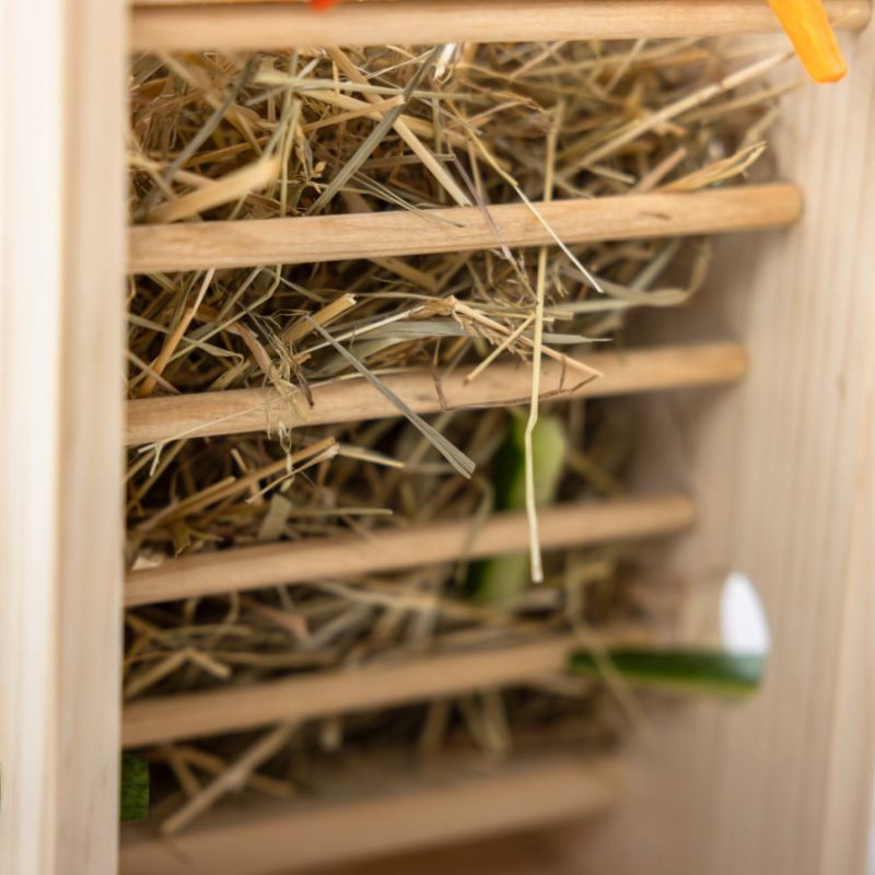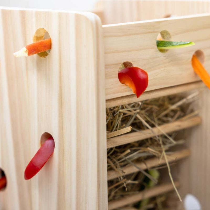 2 az 1-ben kialakítás: a széna- és zöldségtorony kombinált etetőállást kínál széna és zöldségek számára, ami változatos etetési élményt nyújt az állatoknak, és érdekesebbé teszi az etetési időt.