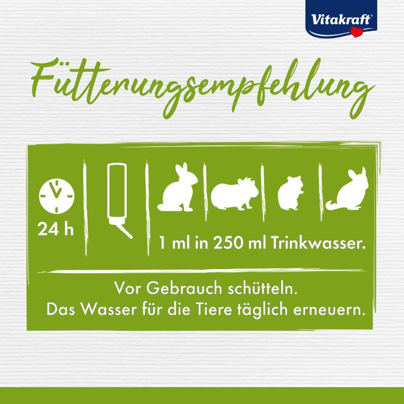 Az ideális kiegészítő a rágcsálók egészséges életéhez: VITA Fit® C-vitamin cseppek! Egyszerűen készítse el frissen a cseppeket az utasításoknak megfelelően, és adja hozzá rágcsálók ivóvizéhez – ez segít megelőzni a tápanyaghiányokat . Ez különösen fontos a tengerimalacok számára, mivel nem tudják maguk előállítani a létfontosságú C-vitamint.