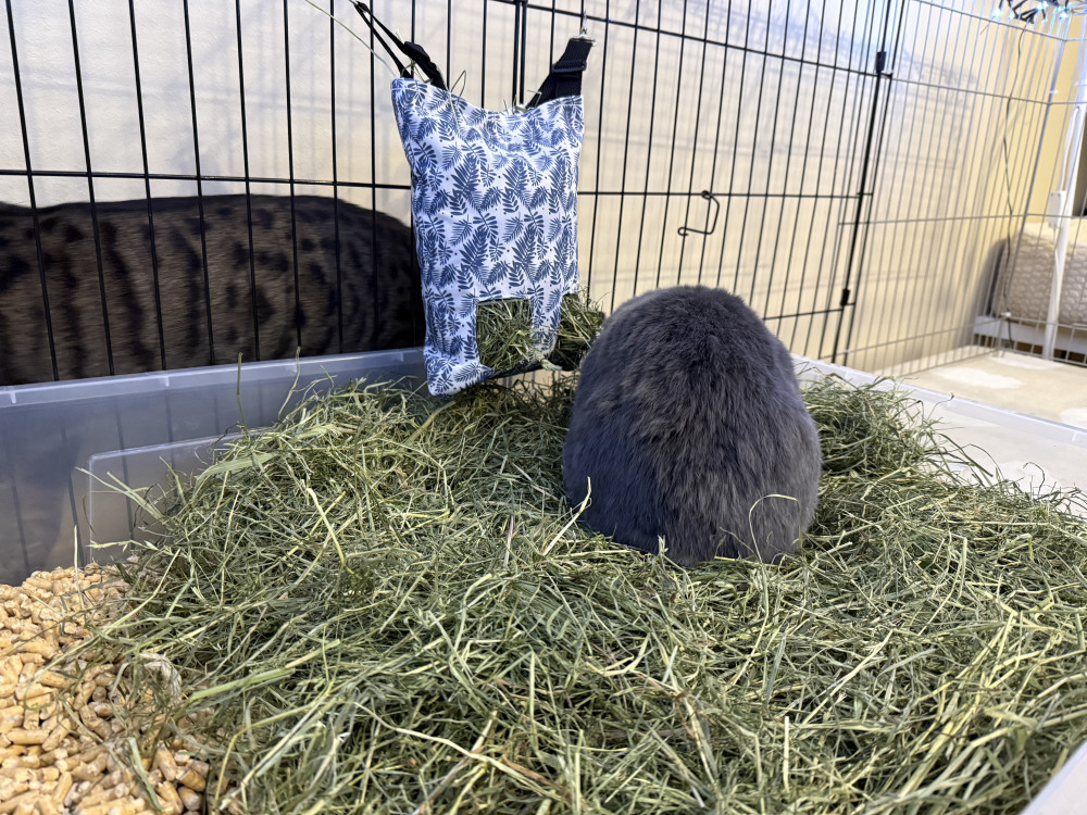A hagyományos rácsos szénatartókkal ellentétben a Neolife textil szénazsák stílusos és rendkívül praktikus. Megvédi a szénát a vizelettől és portól, így kedvenced mindig friss élelemhez jut. A két nyílás lehetővé teszi, hogy akár két nyuszi is egyszerre falatozzon belőle. Az állítható akasztók segítségével pontosan oda helyezheted, ahol a legkényelmesebb az állat számára.