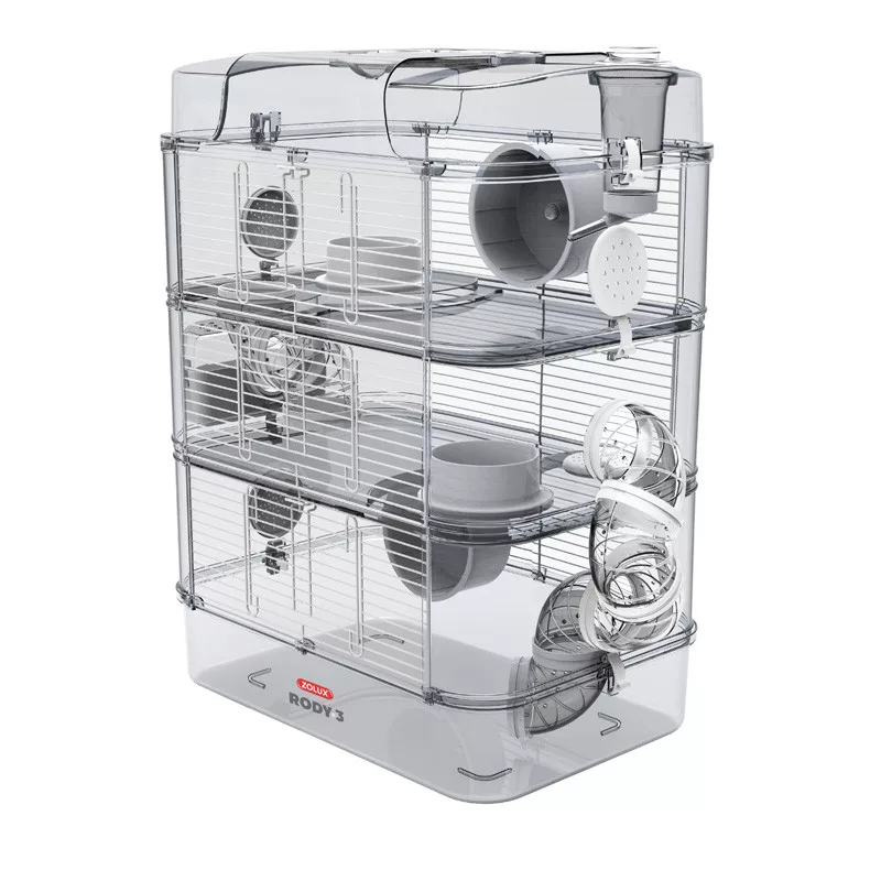 A Zolux Rody 3 Trio a termékcsalád legmagasabb, háromszintes játszóháza és kiegészítő élettere. Fontos hangsúlyozni, hogy kompakt alapterülete miatt önmagában nem alkalmas állandó lakhelynek, viszont tökéletes "kalandparkként" szolgál, ahol kedvenced több szinten is felfedezhet és mozoghat. A három szintet belső lépcsők kötik össze, a készlet pedig két futókereket is tartalmaz, így ideális több kistestű rágcsáló ideiglenes elhelyezésére is a takarítás ideje alatt. Az átlátszó falak modern megjelenést biztosítanak és lehetővé teszik a folyamatos megfigyelést, miközben a rácsos oldalak garantálják a megfelelő szellőzést.